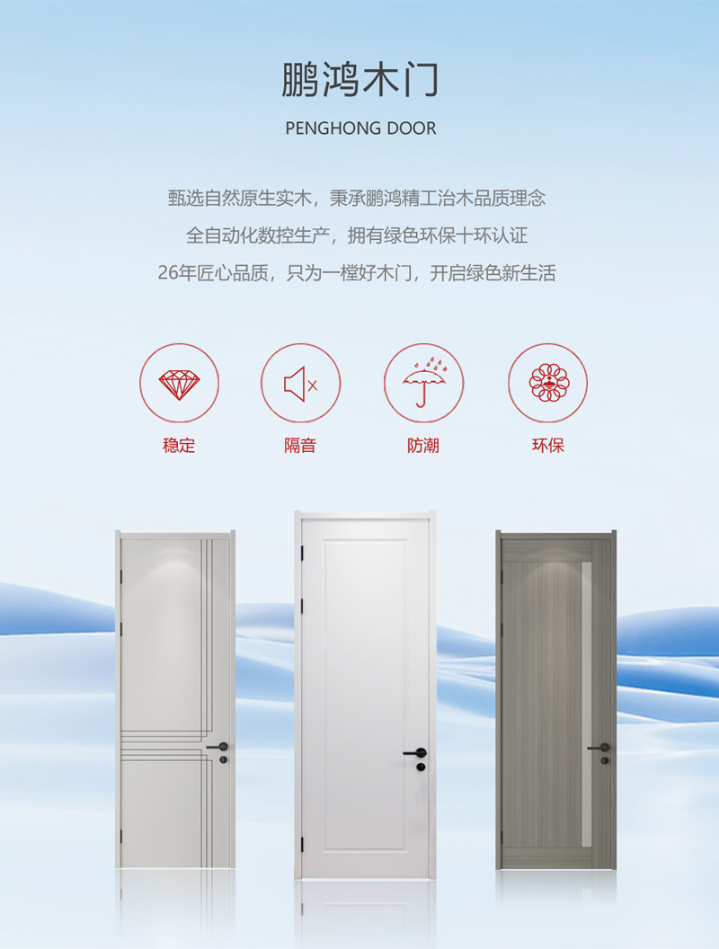 甄選自然原生實(shí)木,秉承鵬鴻精工治木品質(zhì)理念,全自動(dòng)化數(shù)控生產(chǎn),擁有綠色環(huán)保十環(huán)認(rèn)證。26年匠心品質(zhì),只為一樘好木門,開啟綠色新生活。