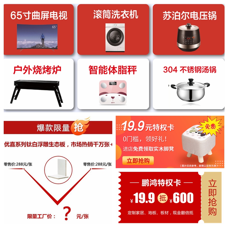 鵬鴻板材、定制家具、木門、地板等產(chǎn)品平均讓利50%,只要支付6.6元認(rèn)購金,即可鎖定優(yōu)惠,先到先得。